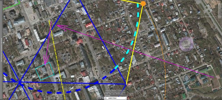 Из центра нашей первой площади проводим линию, совпадающую с осью афишной тумбы. Полученный отрезок помечаем розовым цветом. Зеркально-симметрично проводим аналогичный отрезок из центра другой площади. Находим место их пересечения. Оно, по некой странности, не совпадает с местом пересечения древних каналов, обнаруженных ранее (белые линии по солнечной системе). Не будем обращать внимание на этот факт, и проведём окружность голубого цвета из места пересечения розовых отрезков. В качестве радиуса R возьмём расстояние от этой точки до места, где ранее была старая городская баня, исчезнувшая ещё при СССР. Вначале её достаточно длинное здание укоротили наполовину под жилую застройку, затем оставшуюся часть перестроили, далее её закрыли и забросили совсем. Сейчас там постороннее заведение.